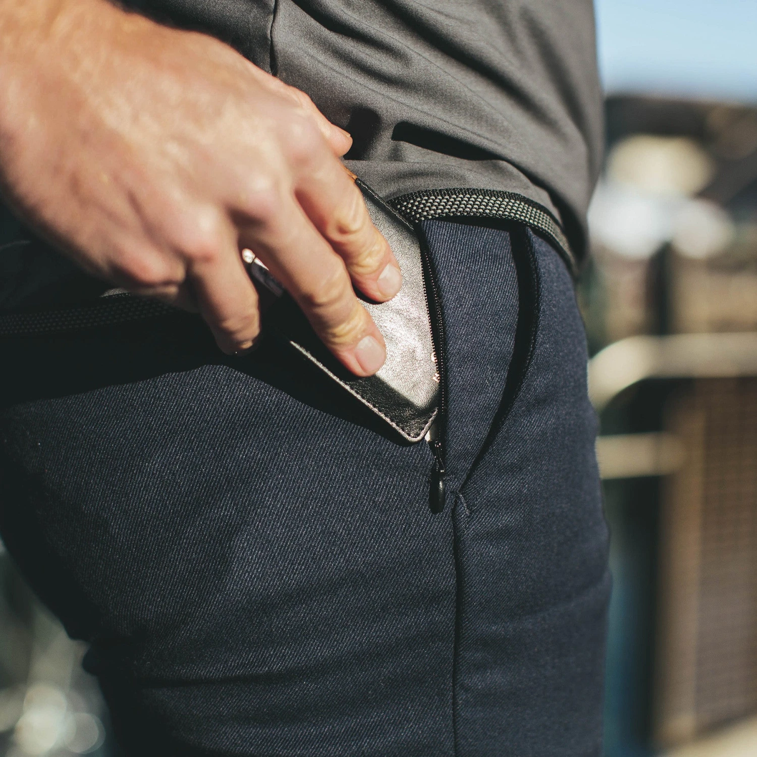 - Hidden zipper on back right welt pocket to keep wallet secure.