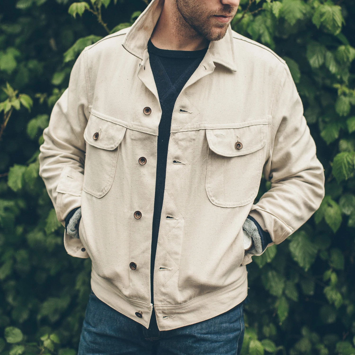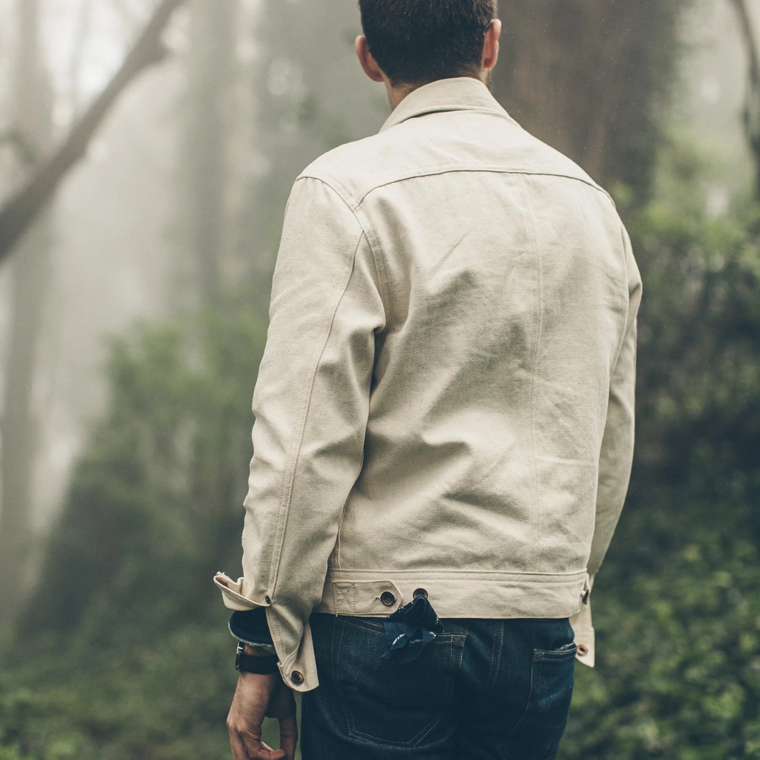- Cuffs, front and back panels with selvage detailing.