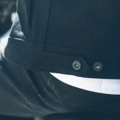 - Custom matte black YKK doughnut buttons.