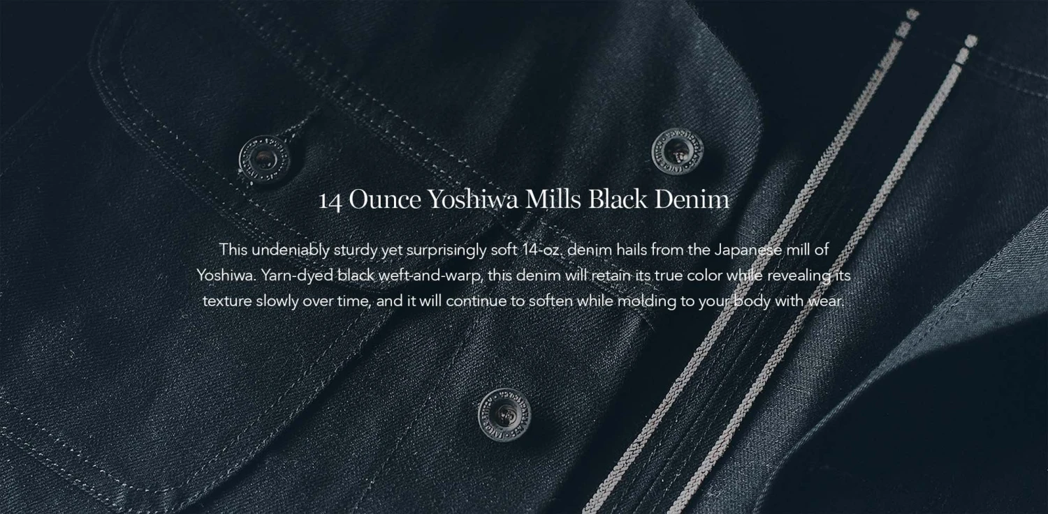 - 14 oz. Yoshiwa Mills black yarn-dyed warp/weft denim.