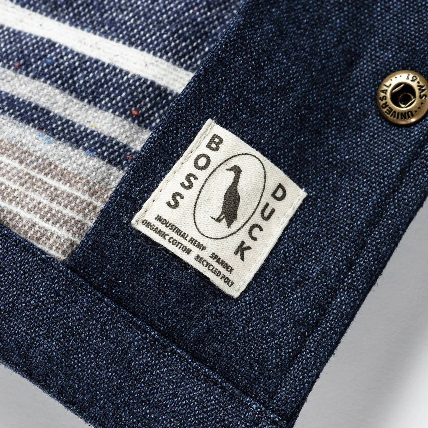 - 12-oz. 54% hemp, 30% recycled polyester, 14% organic cotton, 2% spandex.