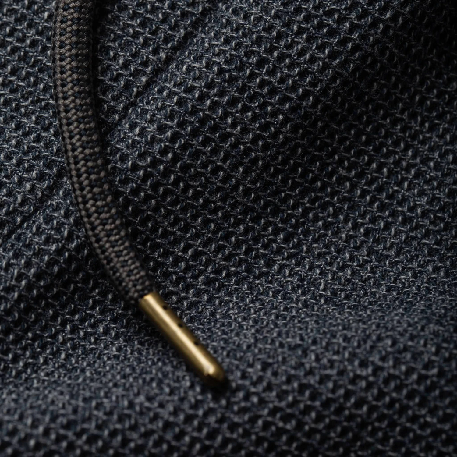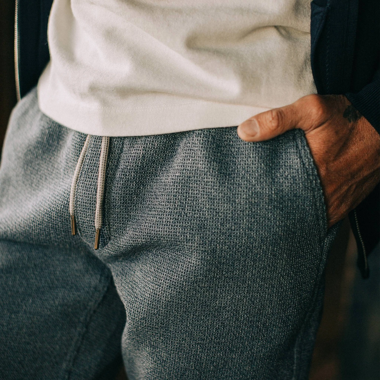 - Elastic waist with navy fleck drawcord with antique brass metal tips.