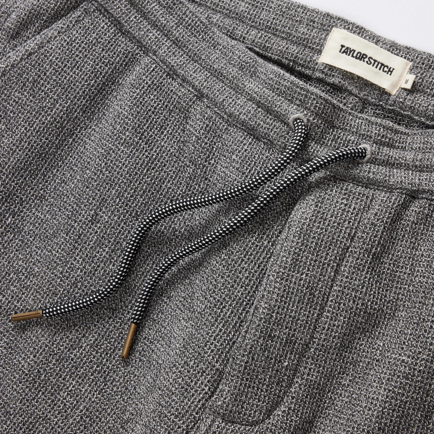 - Elastic waist with charcoal grey fleck drawcord with antique brass metal tips.