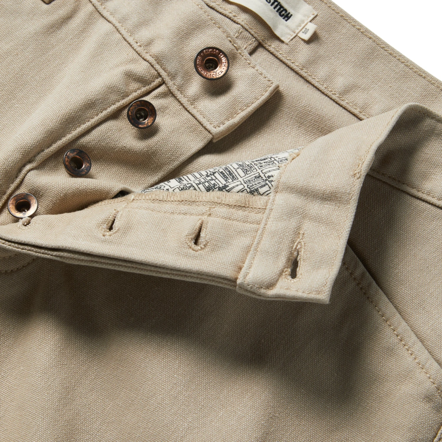 - Button fly closure.