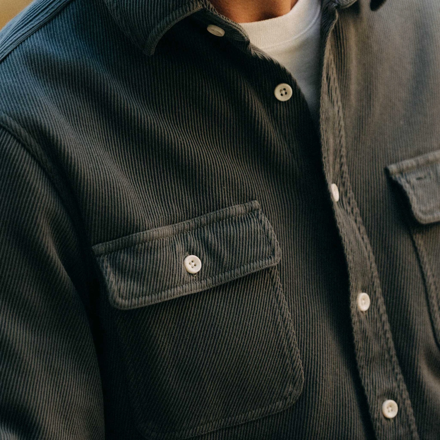 - Two U-shaped chest pockets with button-through flaps.