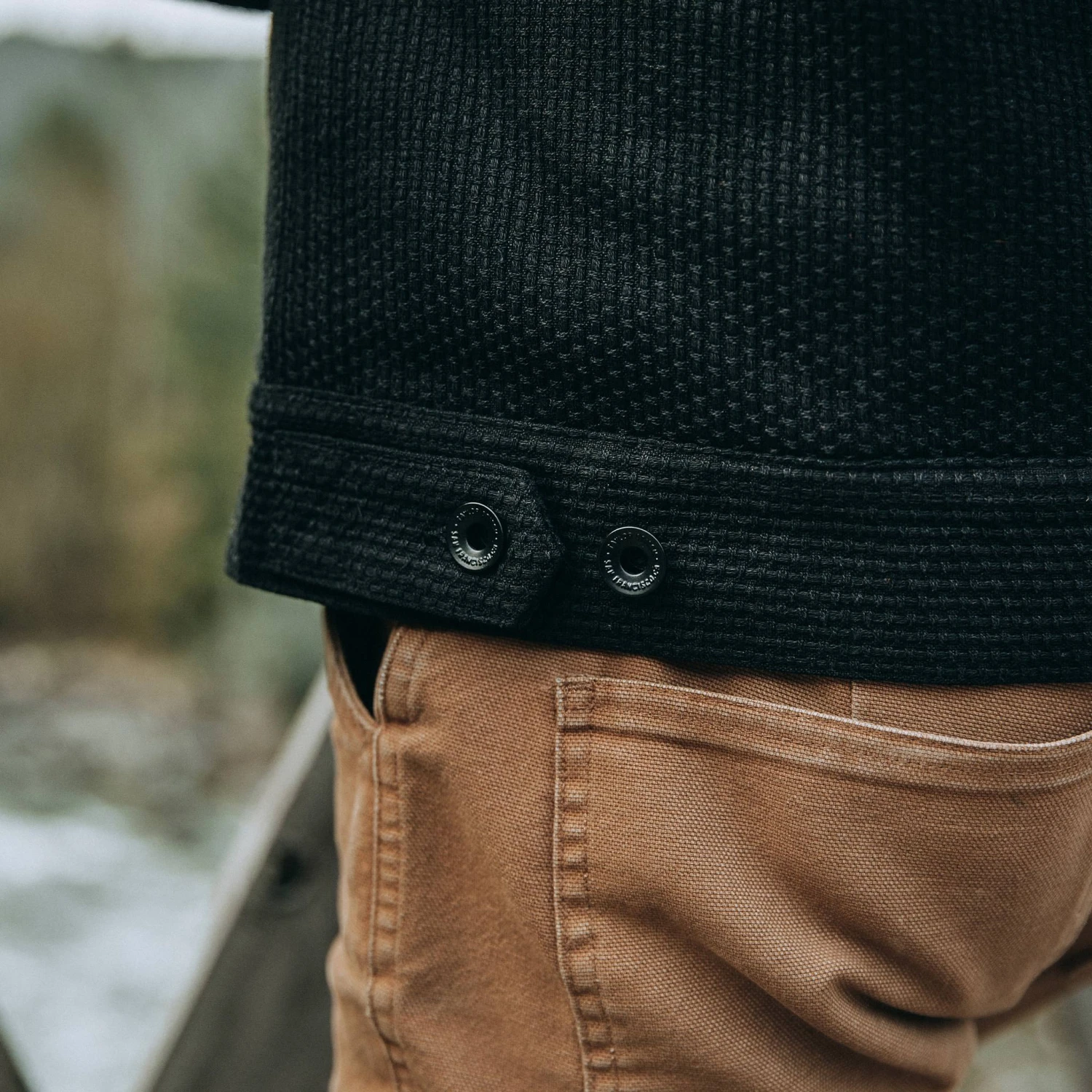 - Custom-developed black YKK doughnut buttons & rivets.