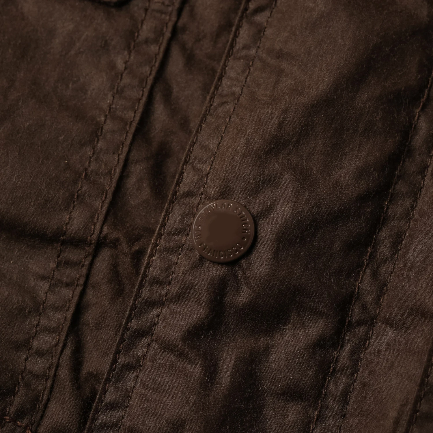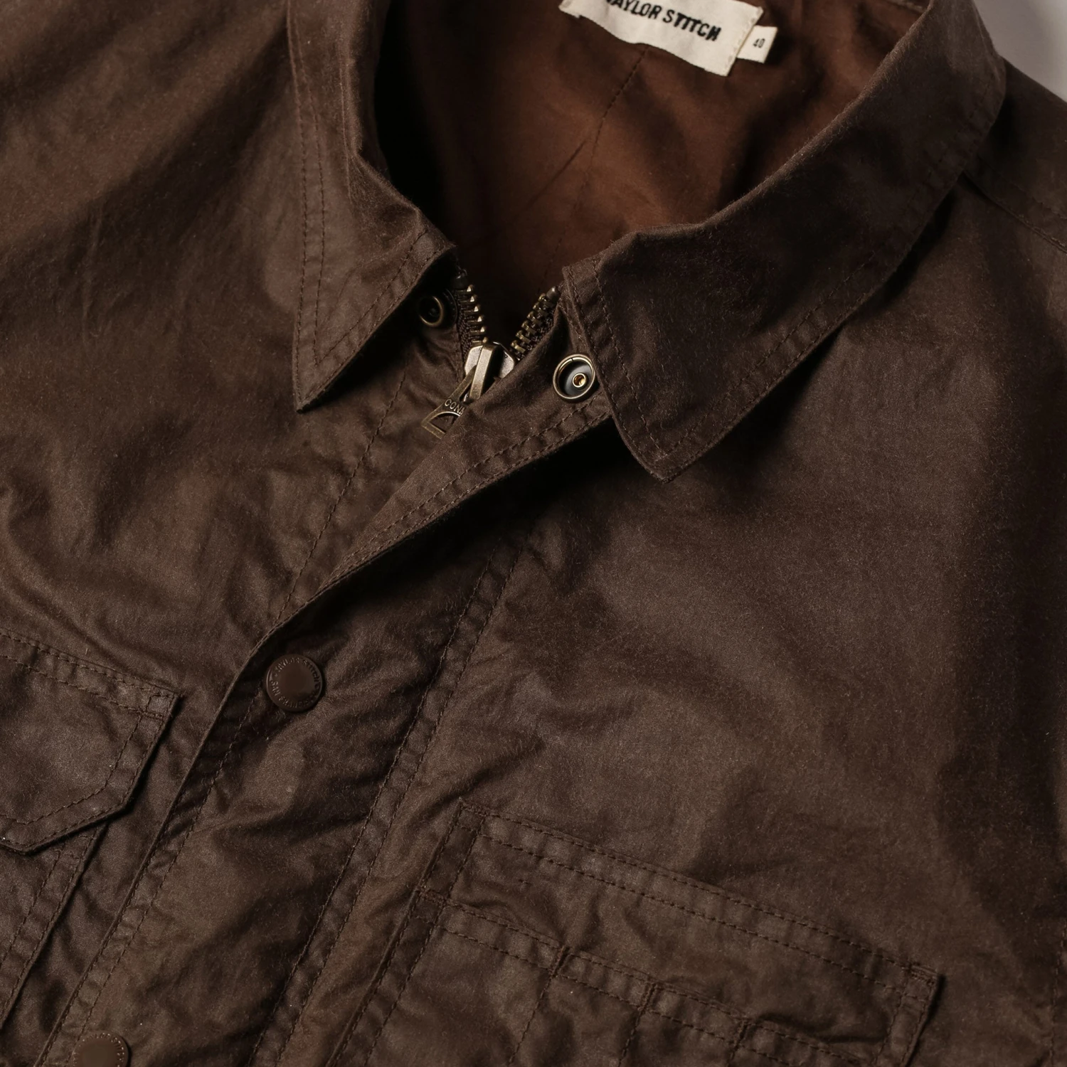 - Conmar zipper at center front with storm flap closure with enamel finish Taylor Stitch snaps.