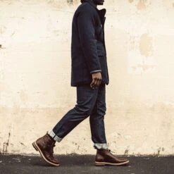 - Navy naked cowhide leather accents at triangle welts reinforcement, underside of the collar stand, and cuff hem.