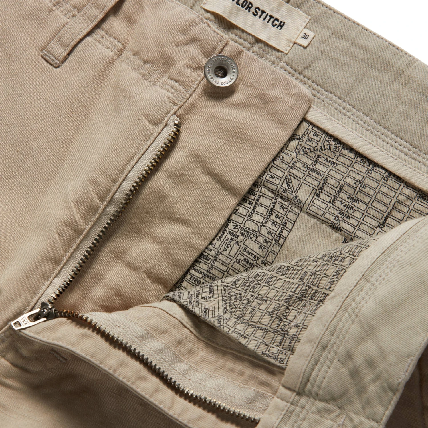 - YKK top button and zip fly closure.