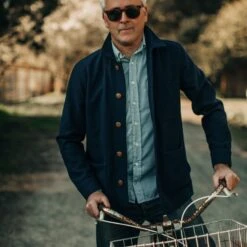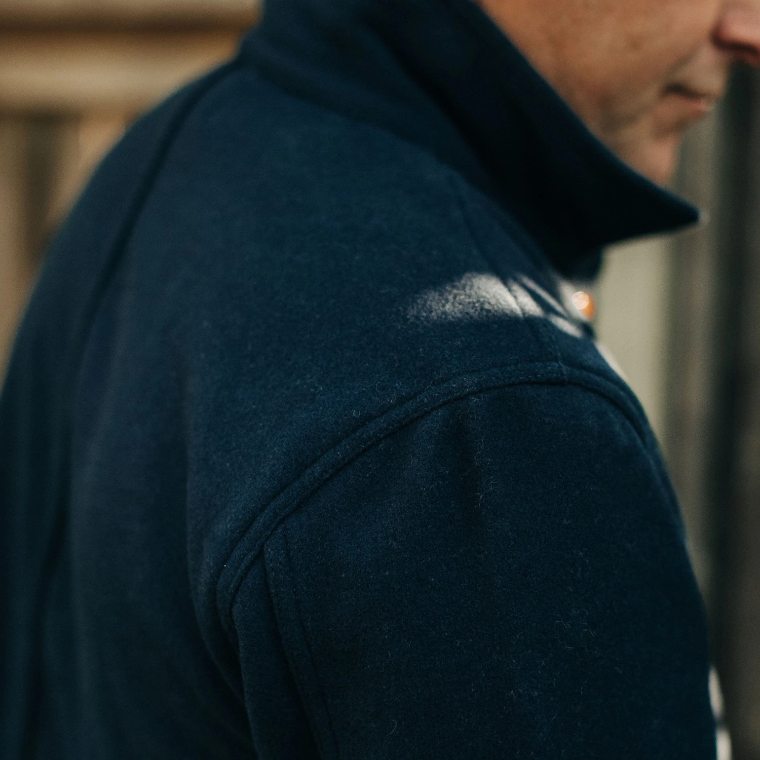 A timeless silhouette with serious sophistication. The Ojai Jacket in Navy Boiled Wool by Taylor Stitch.