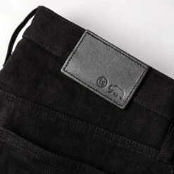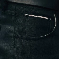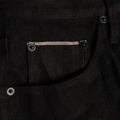 - Custom developed inky black 3×1 selvage denim.